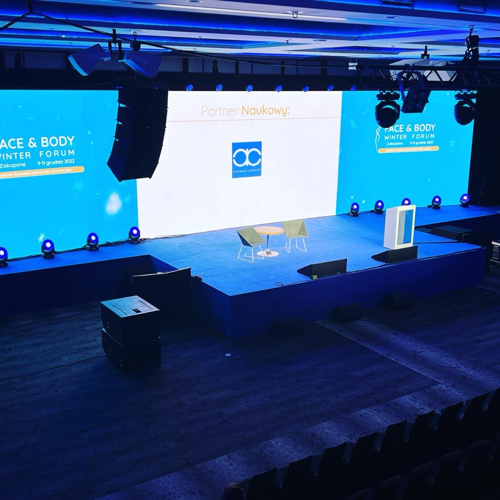 W połączeniu z oświetleniem scenicznym (Prolights Astra Hybrid 330, Robe 800, Portman P1 Evo, Sunstripy) da się zbudować kompletną, dynamiczną oprawę eventu – zarówno dla uczestników na sali, jak i dla tych przed ekranem.
